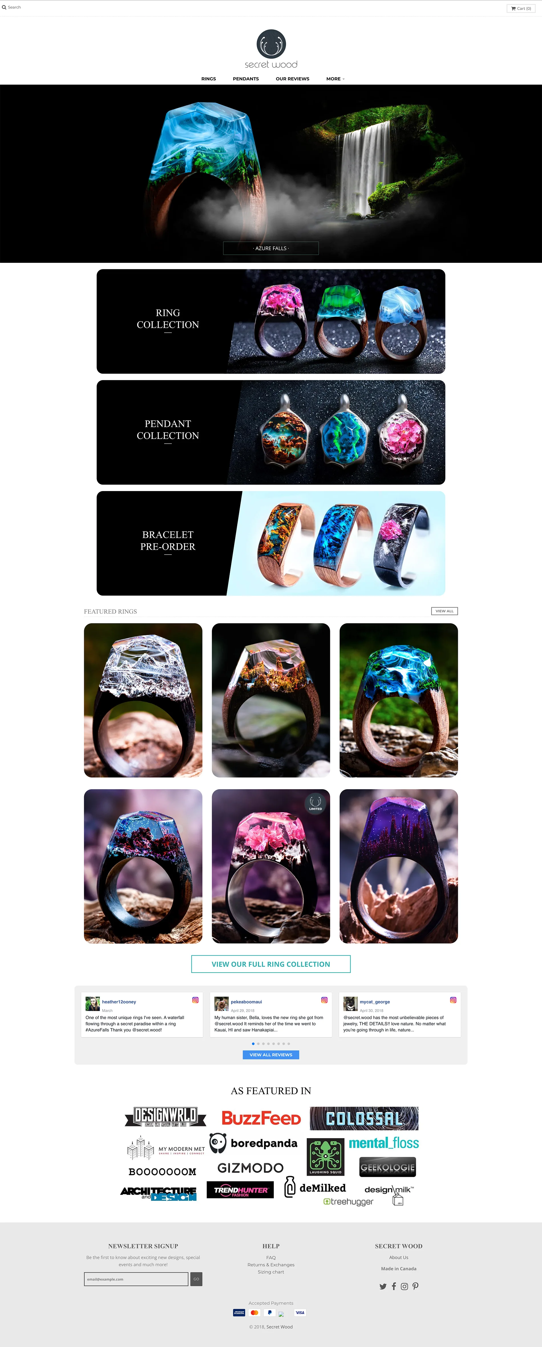 Secret Wood made jewelry that went viral — tiny landscapes embedded in resin rings, handcrafted one at a time. I owned the full product layer: visual concept, art direction, UX, storefront design, and every line of front-end and back-end code. The goal was to build infrastructure that could scale without eroding what made the product worth buying.